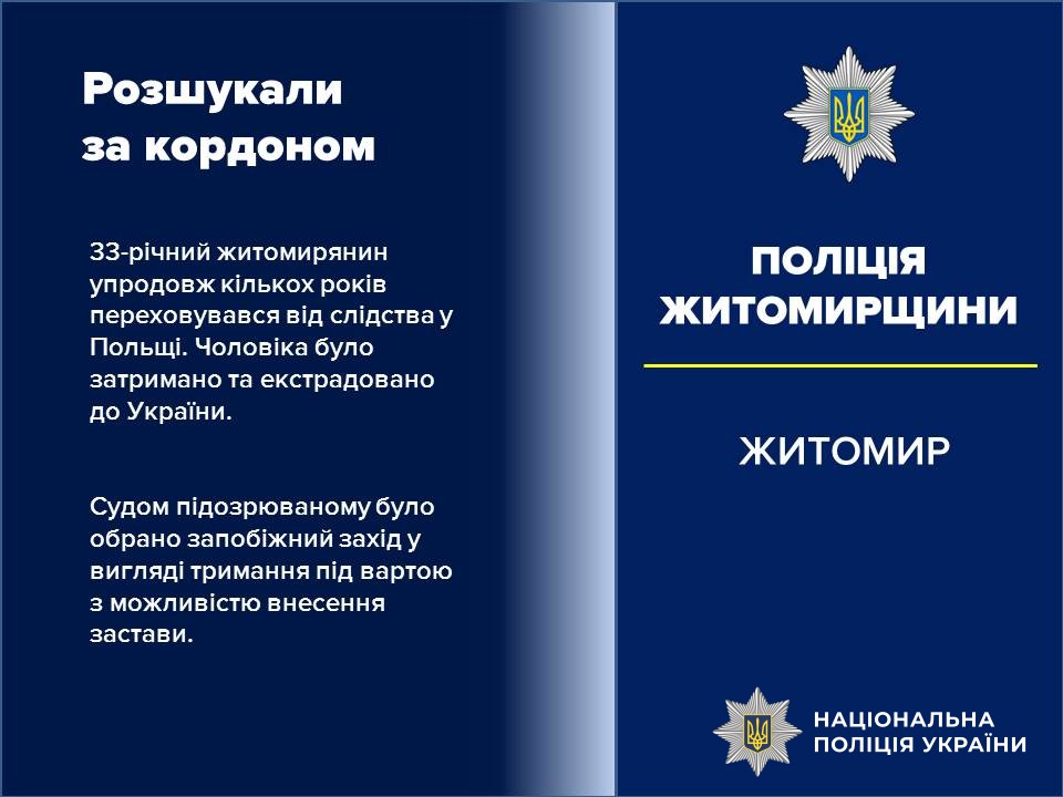 33-річний житомирянин упродовж кількох років переховувався в одній з сусідніх країн. За ініціативи оперативників Житомирського районного управління поліції та сектору міжнародного поліцейського співробітництва ГУНП в області чоловіка було затримано та екстрадовано до України.