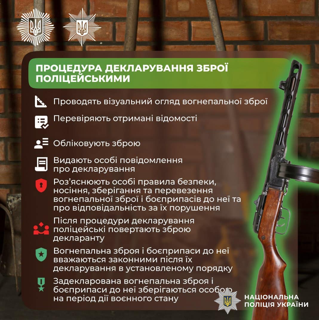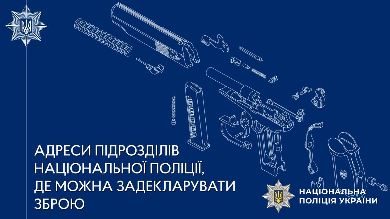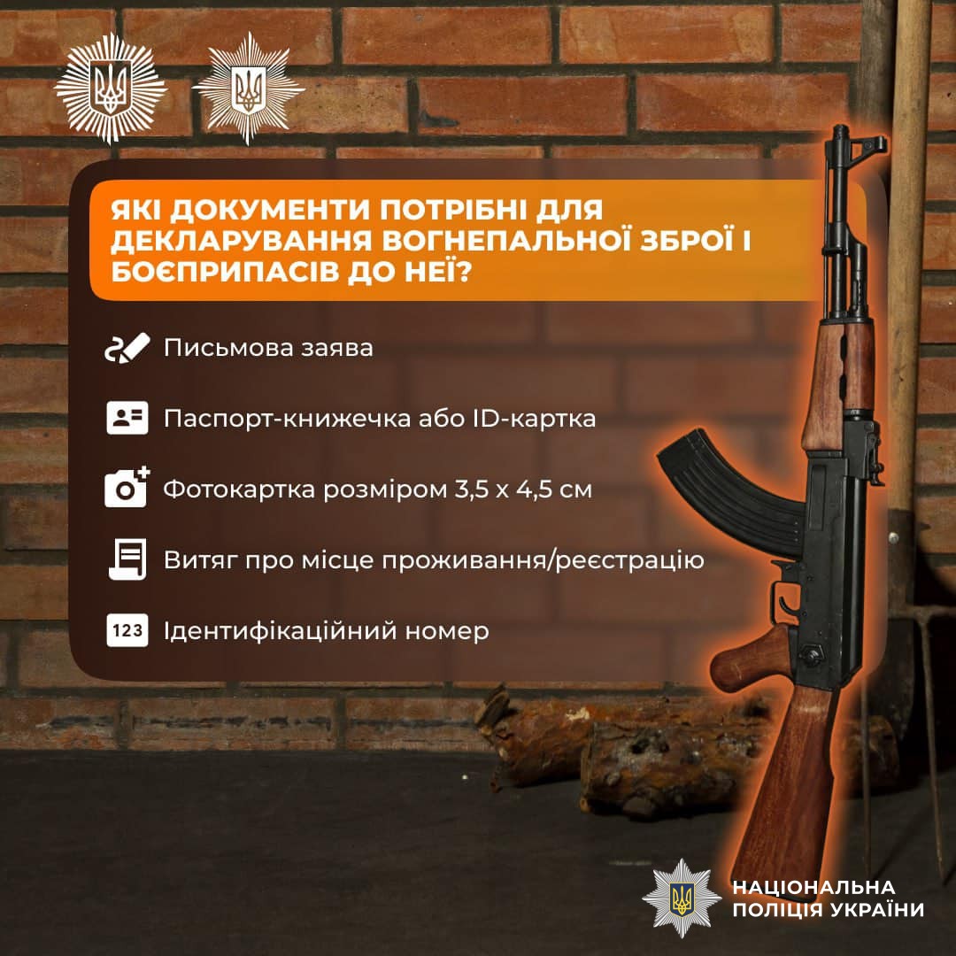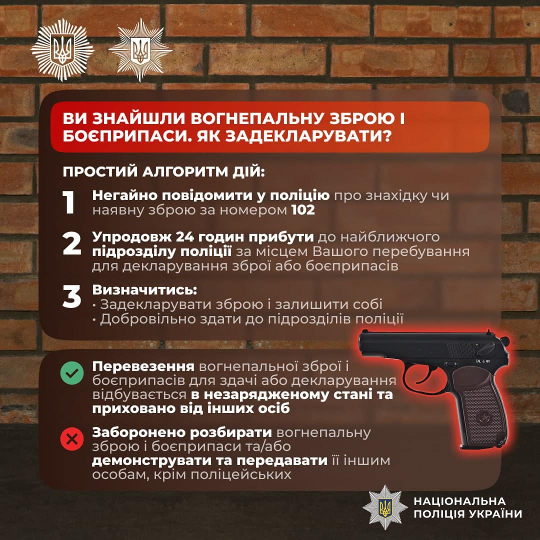 Якщо ви знайшли вогнепальну зброю та боєприпаси до неї, вам необхідно негайно їх задекларувати. Зробити це можна у підрозділах найближчому до вас підрозділі Національної поліції (натисніть, щоб побачити адреси).