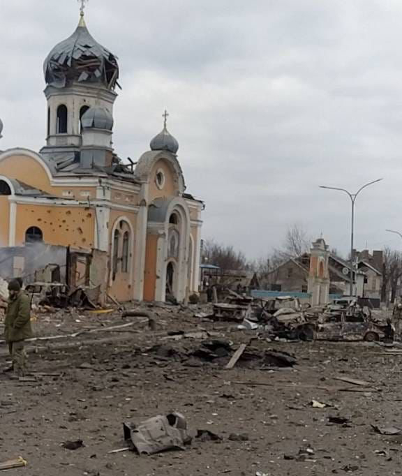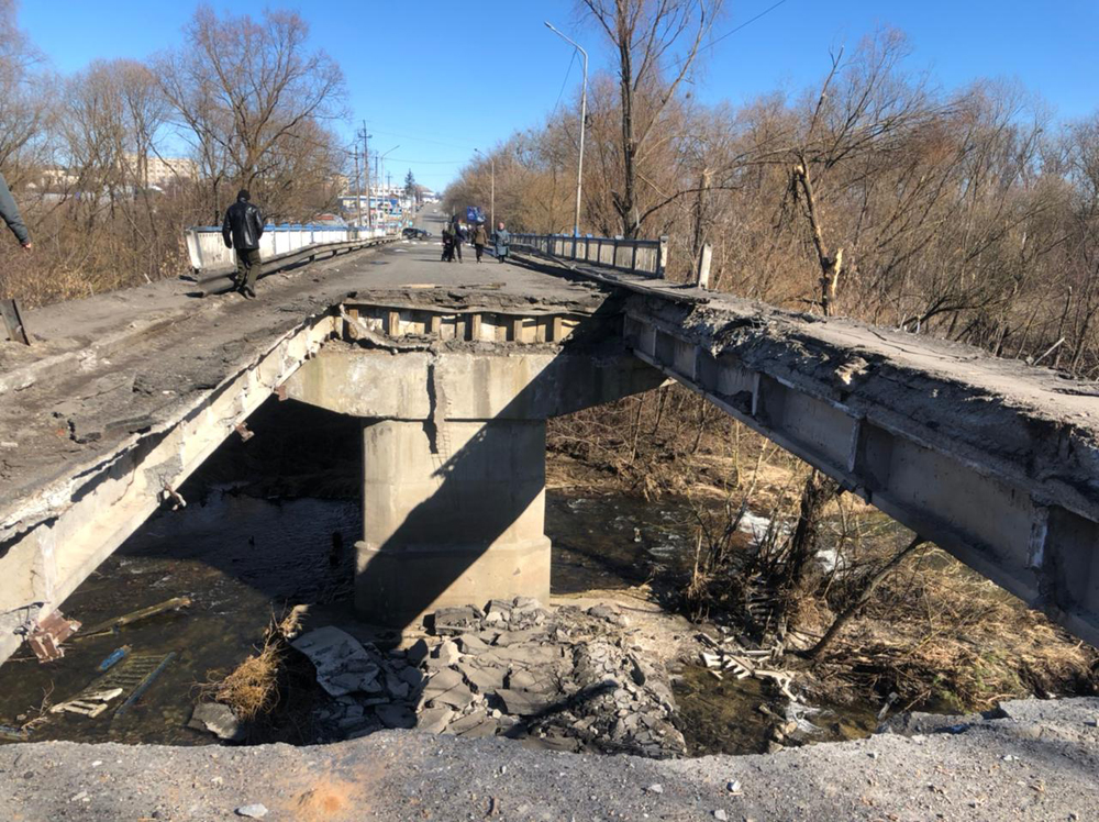 Десь на початку березня відбувся авіаудар по місту. Ми так розуміємо, що з літаків обстріляли міст, цей, що зараз за спиною. Того ж дня було влучення у військкомат у центрі міста. Скинута авіаційна бомба на саму площу. І того ж дня, видно, намагалися зруйнувати усі під’їзні/виїзні шляхи. Мали намір ударити по залізничному мосту. Але, слава Богу, вони не попали у той міст, лише біля нього, були незначні пошкодження.