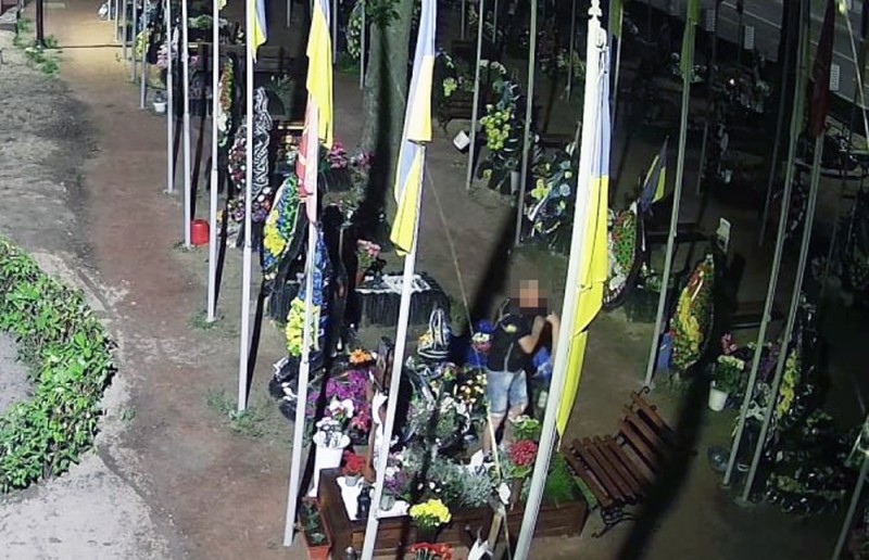 Оперативники Житомирського районного управління поліції переглянули записи камер відеоспостереження неподалік місця вчинення правопорушення. Там було зафіксовано, як невідомий чоловік підходить до могил, забирає звідти світлодіодний ліхтар та прапори і йде геть.
