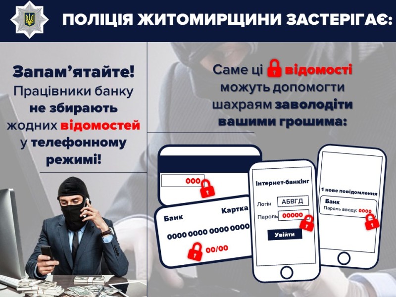 Водночас поліцейські нагадують: перевіряйте будь-яку інформацію, що пов’язана з обігом ваших коштів. Ніколи й нікому не повідомляйте номер банківської картки, термін її дії, CVV2-код, паролі, що надходять в SMS-повідомленнях.