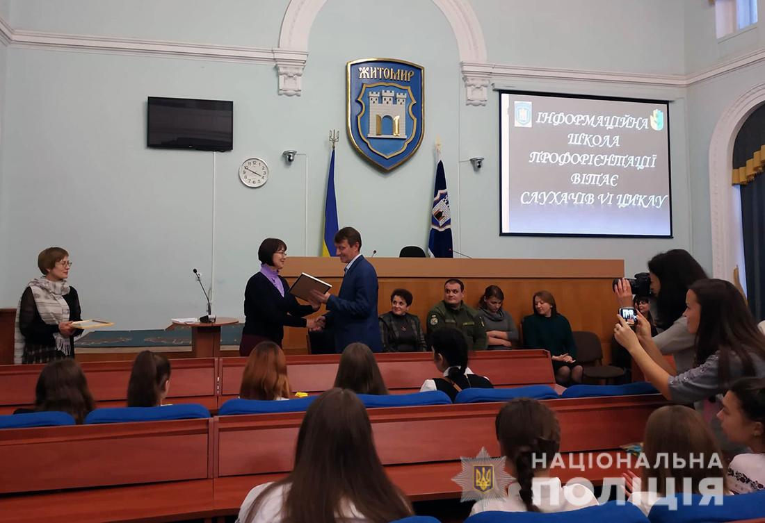 12 грудня у приміщенні сесійної зали Житомирської міської ради відбулося офіційне закриття VI циклу Інформаційної школи профорієнтації для дітей та молоді в рамках проекту «Шлях до майбутньої професії». Поліцейські, які брали активну участь у заході, підсумували результати проведеної роботи.
