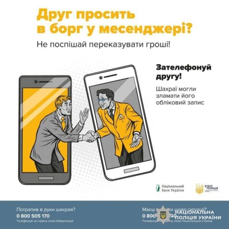- якщо ви отримали повідомлення з проханням про позику чи фінансову допомогу, не поспішайте: зателефонуйте людині особисто, щоб переконатися, що вона дійсно зверталася до вас з таким запитом;