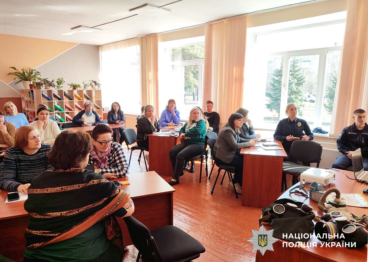 Старша інспекторка сектору освітньої безпеки Олена Зайцева організувала пізнавальну бесіду з педагогами Новогуйвинського ліцею ім. С. Процика. До поліцейської також долучилися фахівці ДСНС.
