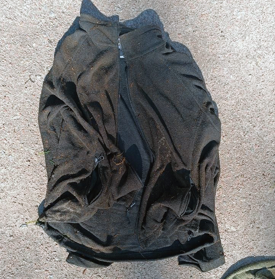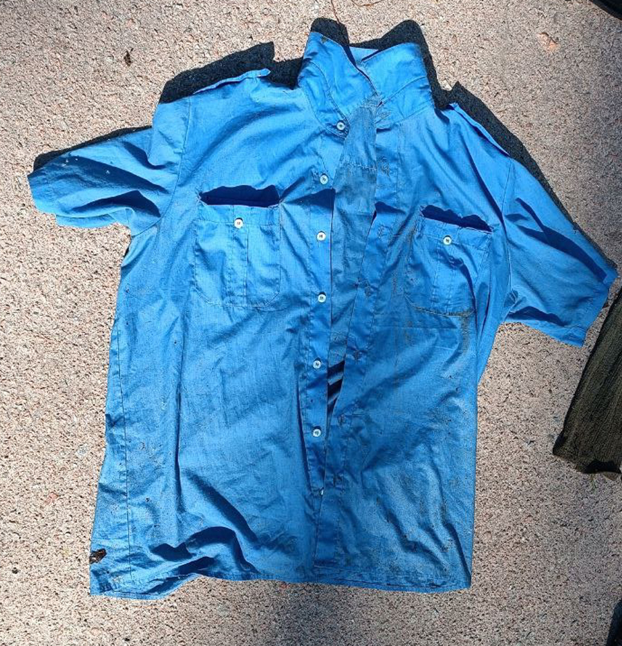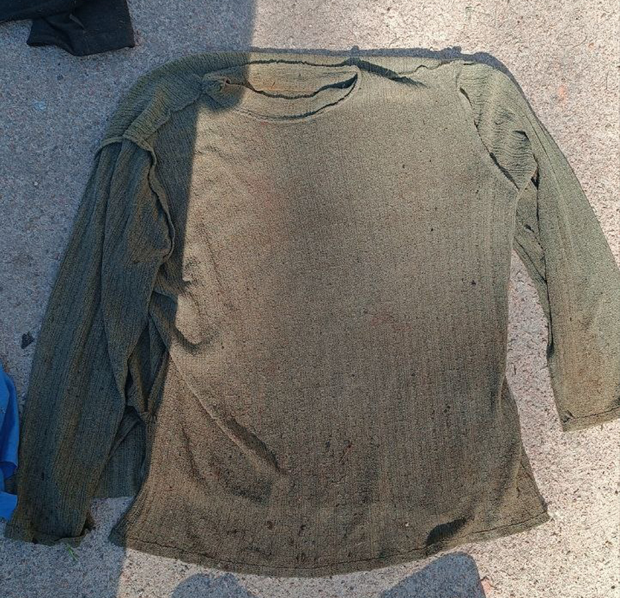 Був одягнений у блакитну сорочку-теніску, сірий светр та кофту на замку чорного кольору, сині джинси, чорну натільну білизну та черевики чорного кольору.