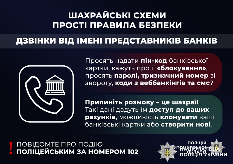 - у разі дзвінків з інформацією про проблеми з фінансовими рахунками слід перервати телефонну розмову та особисто зателефонувати у службу підтримки банку за номером, вказаним на звороті вашої картки, та уточнити всі обставини. Або особисто завітайте у банківське відділення та уточніть необхідну інформацію.