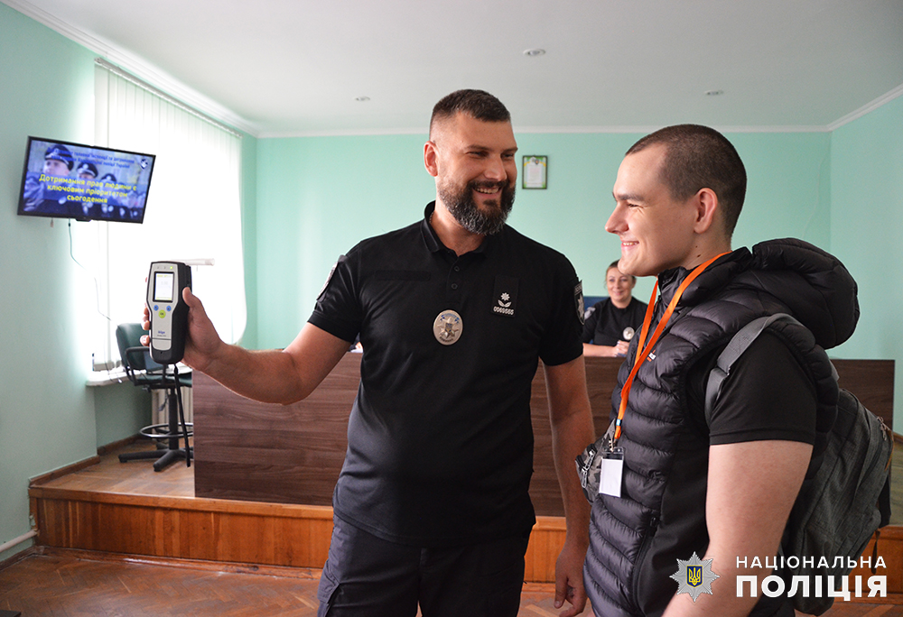 Про основні функції управління головної інспекції ГУНП в Житомирській області розповів начальник відділу підтримки управління Віктор Шиманський. Серед іншого він розповів про принцип роботи пристрою для тестування щодо вживання алкоголю. Студенти побачили роботу алкотестера в дії.